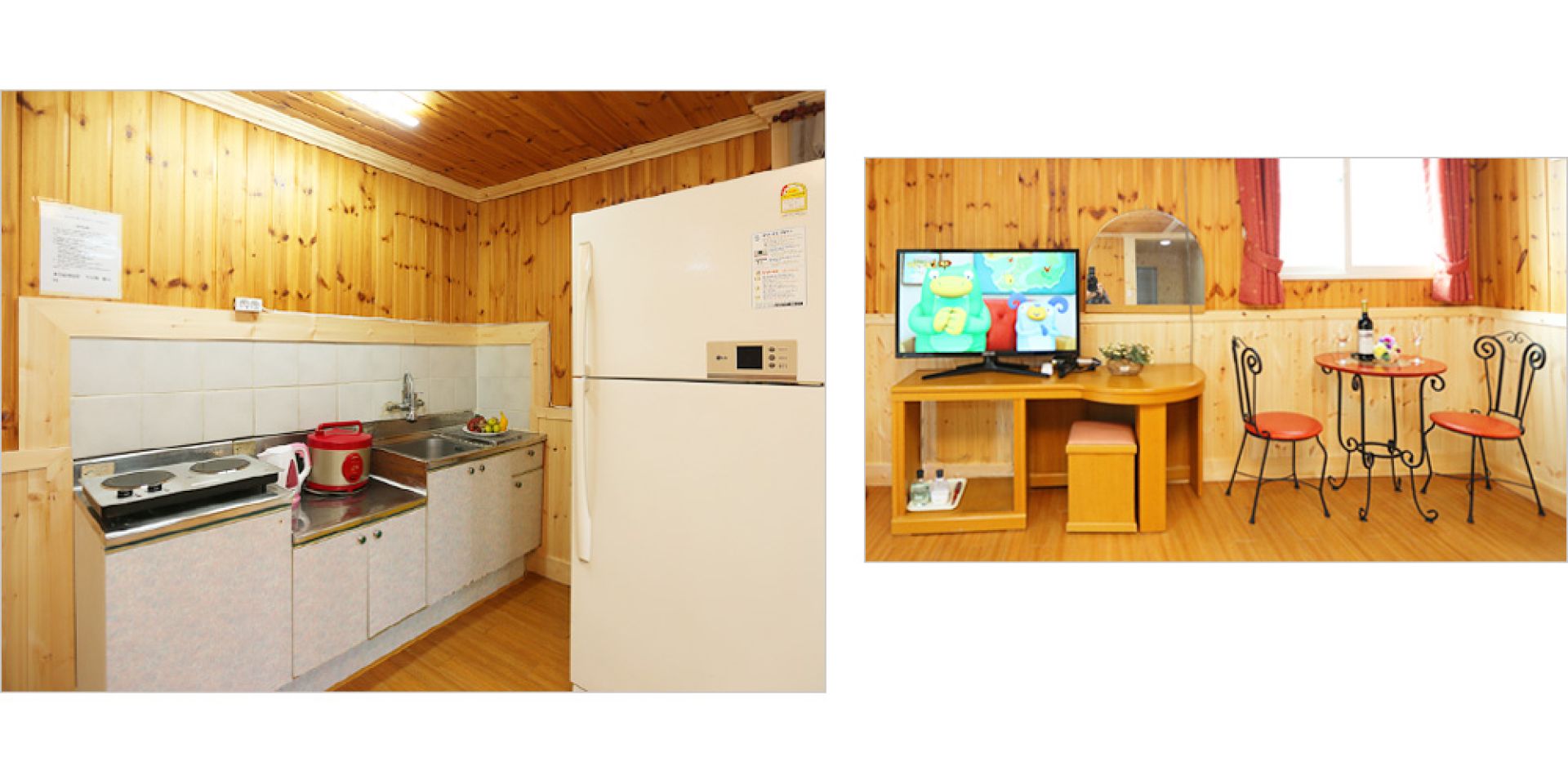 - 시설 : TV(40인치), 소파, 침대, 이불장, 에어컨, 화장대, 무선주전자, 냉장고, 인덕션, 전기밥솥, 전자레인지, 취사도구 일체 등 바비큐시설 등개별테라스