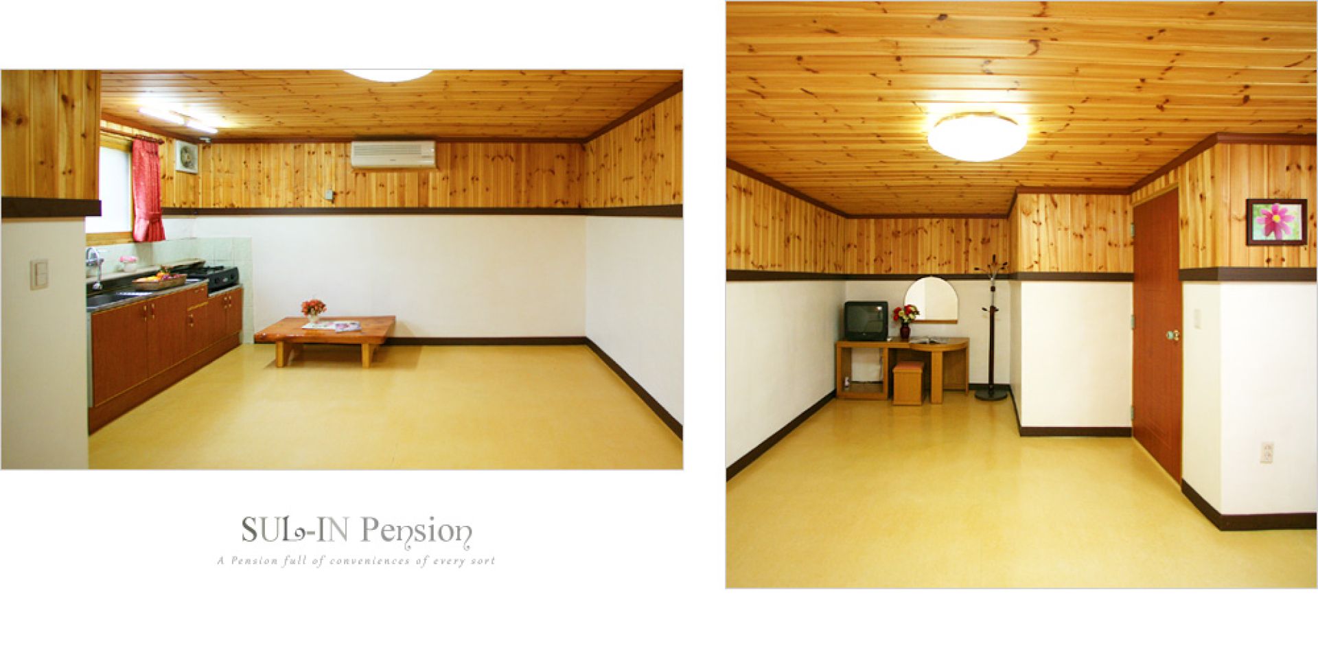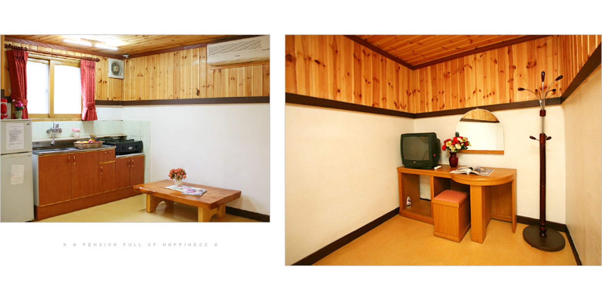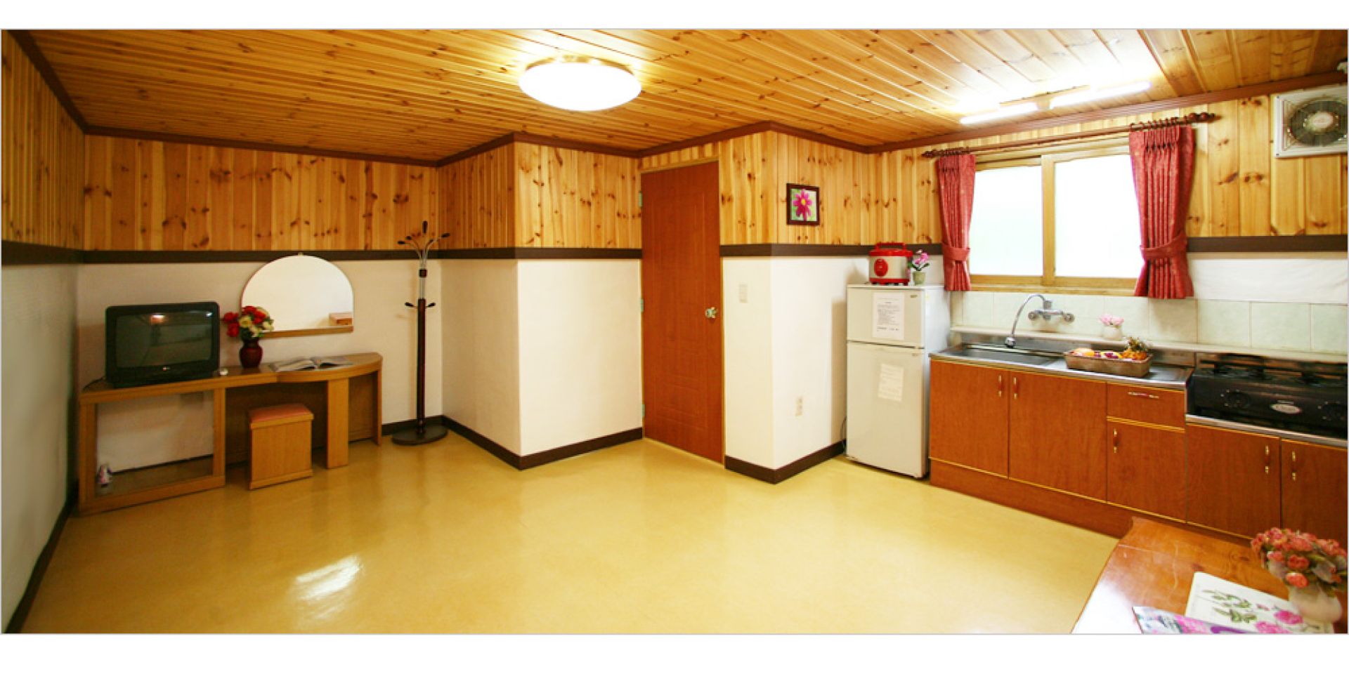 • 시설 : TV(40인치), 식탁, 이불장, 에어컨, 침대, 화장대, 무선주전자, 냉장고, 인덕션, 전기밥솥, 취사도구 일체 등 바비큐시설 등