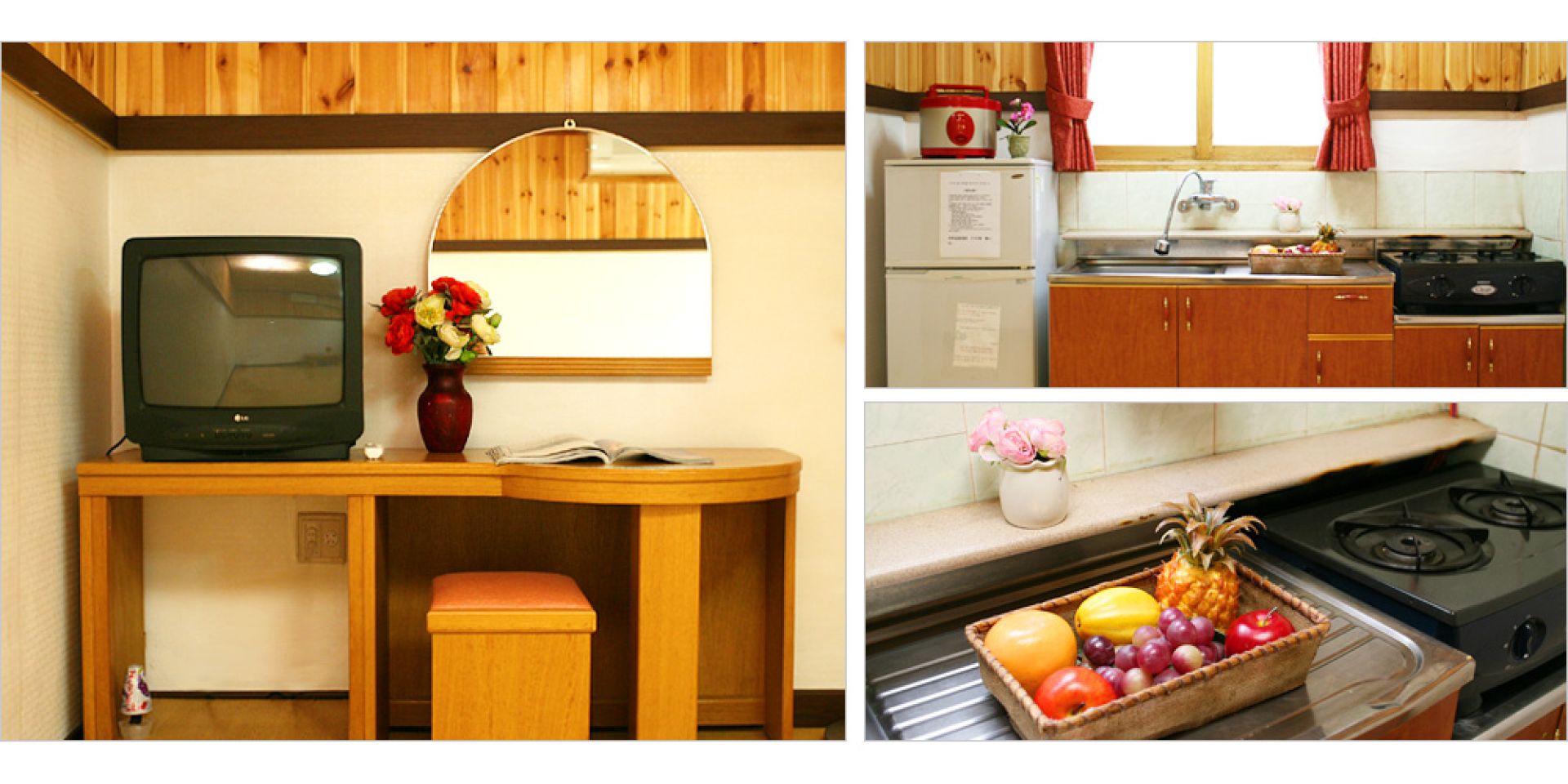 - 시설 : TV(40인치), 식탁, 이불장, 에어컨, 침대, 화장대, 무선주전자, 냉장고, 인덕션, 전기밥솥, 취사도구 일체 등 바비큐시설 등