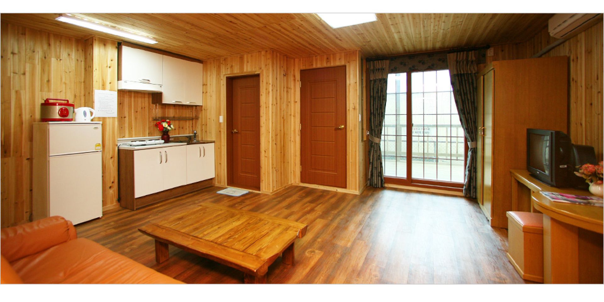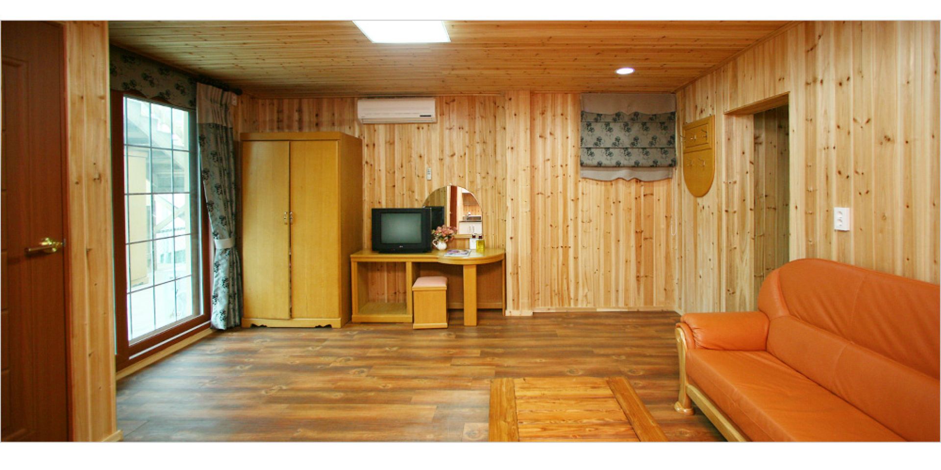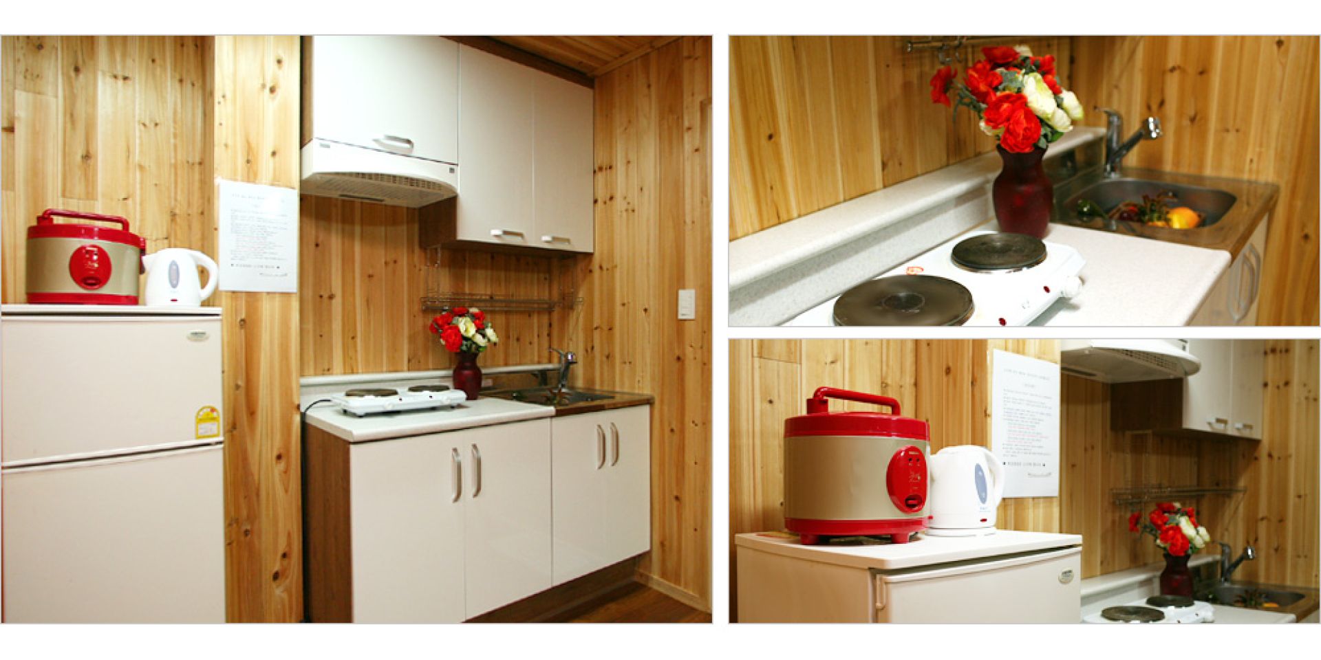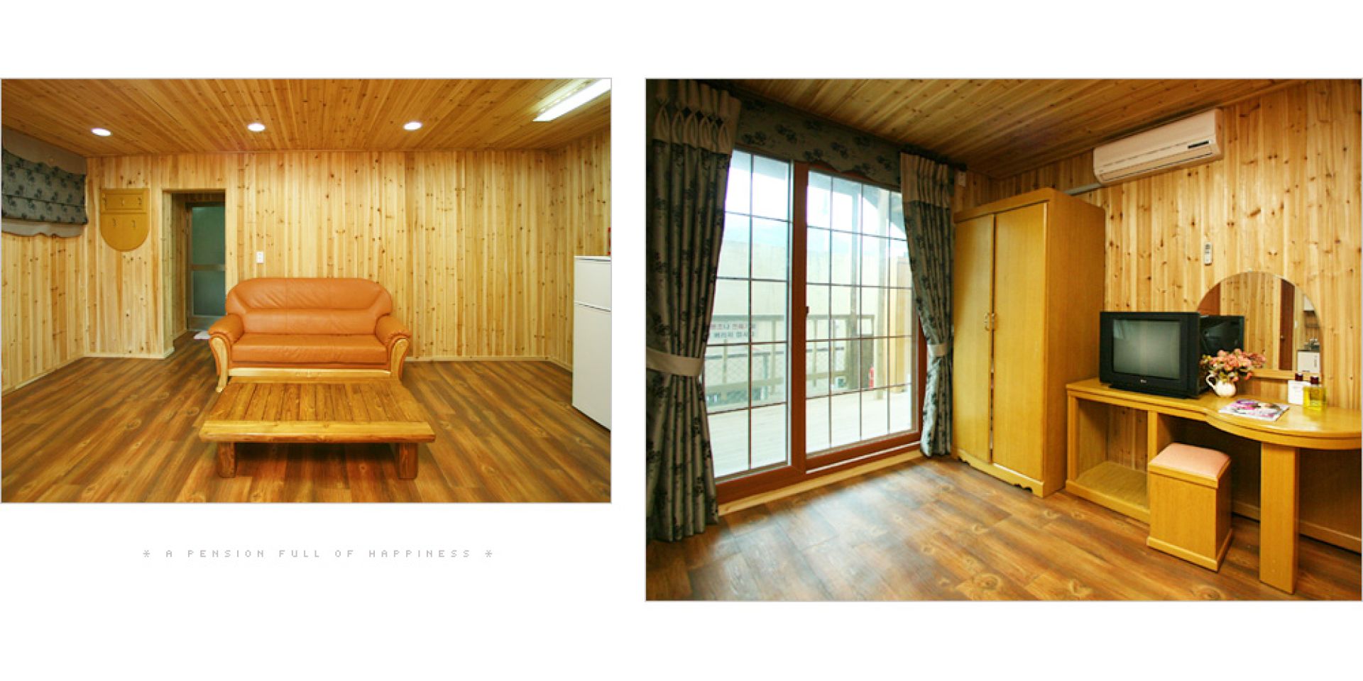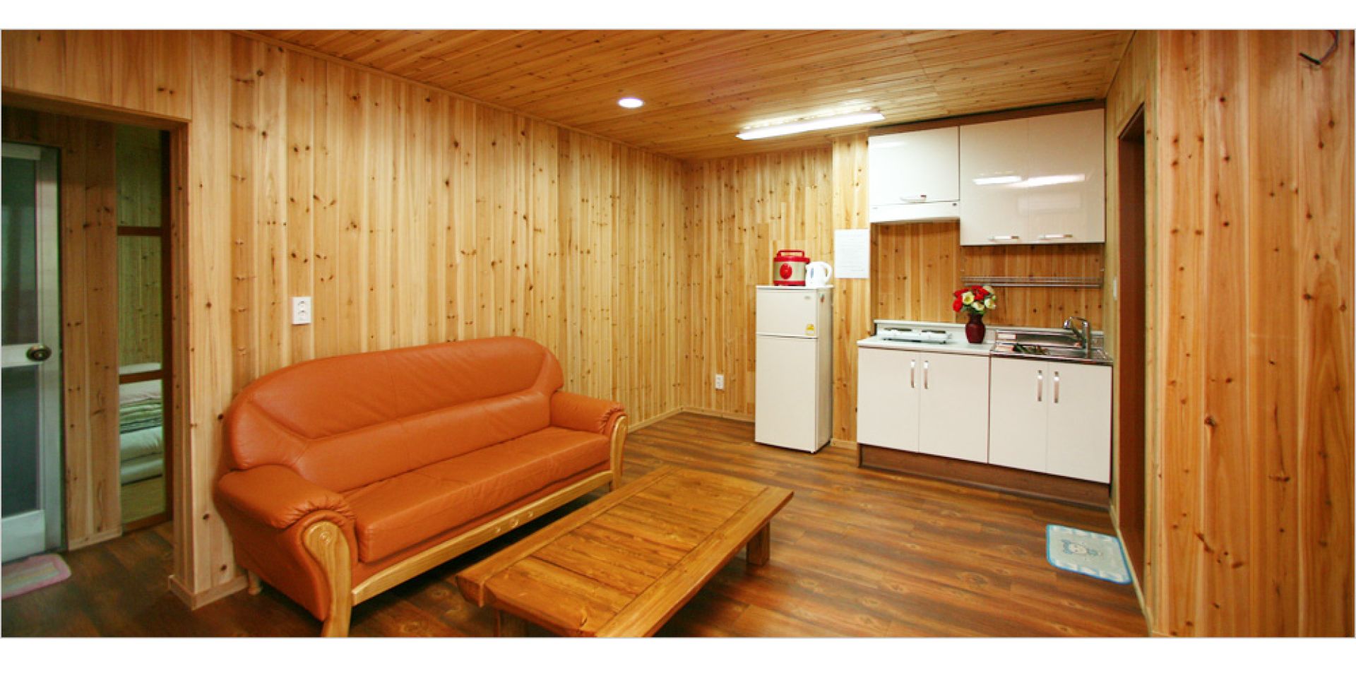 - 시설 : TV(40인치), 소파, 침대, 이불장, 에어컨, 화장대, 무선주전자, 냉장고, 인덕션, 전기밥솥, 전자레인지, 취사도구 일체 등 바비큐시설 등개별테라스
